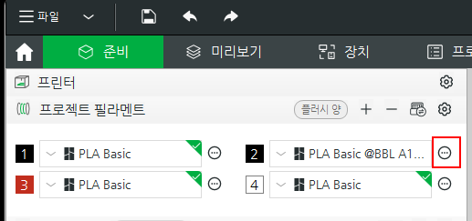 2번과 마찬가지로 [준비]탭에서 필라멘트의 ••• 클릭 후 수정 클릭