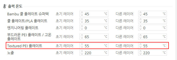 베드의 온도를 낮춰주면 안착이 잘된다는 글이 있었다. 우선 55로 변경해주었다.