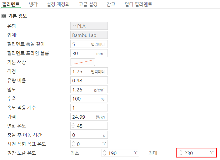 권장 노즐 온도가 기본 최소 190, 최대 240 이였는데 최대값을 230으로 변경해주었다.